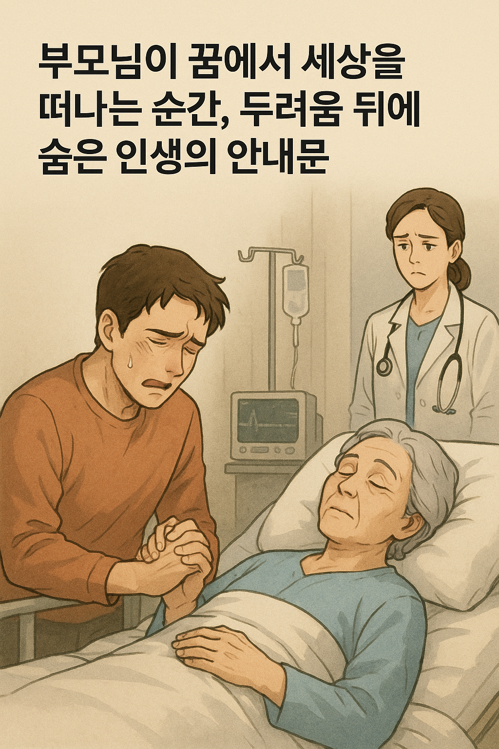 한밤중에 문득 깨어났을 때 부모님이 눈앞에서 떠나는 장면이 생생하게 남아 있다면 그 충격은 말로 다 표현하기 어렵습니다. 꿈속에서 병원복을 입으신 채 마지막 숨을 내쉬는 얼굴을 바라보는 순간 심장이 내려앉는 듯한 아픔이 몰려듭니다. 현실에서 사랑하는 존재를 잃을까 두려워하는 심리가 그대로 반영되기 때문입니다. 그러나 이러한 꿈은 실제 불행을 예고하기보다는 새로운 변화를 맞이할 준비가 필요하다는 상징으로 자주 해석됩니다. 불안을 느꼈다면 최근 삶의 방향이나 가족 관계를 점검해 보시기 바랍니다.