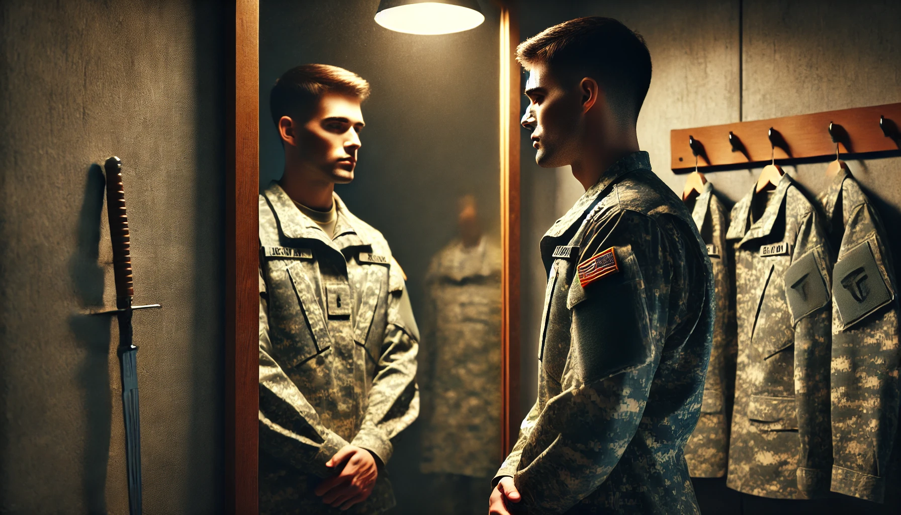 군복을 입고 거울을 보는 장면